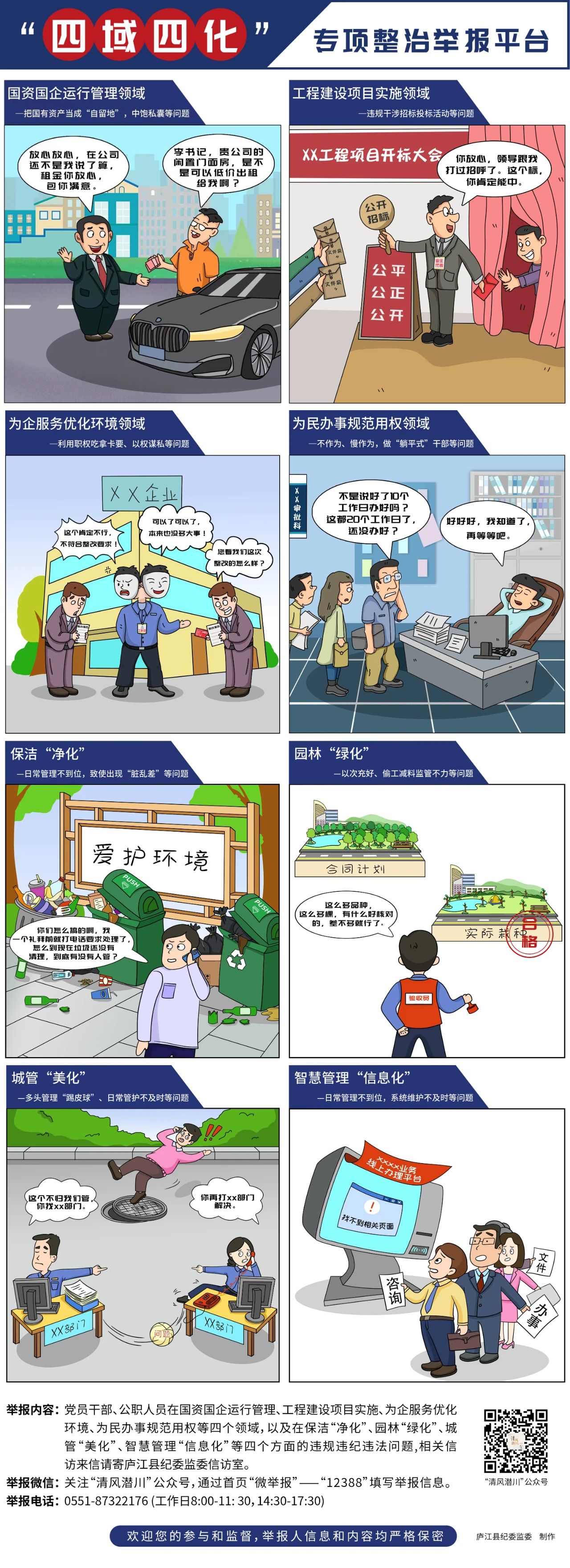按照部署,我县正在开展国资国企运行管理、工程建设项目实施、为企服务优化环境、为民办事规范用权等四个领域,以及保洁“净化”、园林“绿化”、城管“美化”、智慧管理“信息化”等四个方面突出问题专项整治工作,为让广大群众对“四域四化”重点查纠的问题有更加形象、直观的认识,庐江县纪委监委制作了《“四域四化”专项整治举报平台宣传漫画》,欢迎社会各界关注!