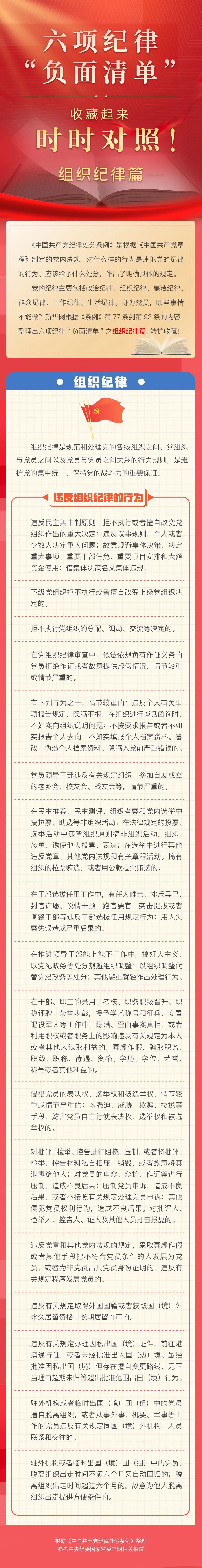 当前,全党正在开展党纪学习教育。这次党纪学习教育明确要聚焦解决一些党员、干部对党规党纪不上心、不了解、不掌握等问题,组织党员特别是党员领导干部认真学习《中国共产党纪律处分条例》,做到学纪、知纪、明纪、守纪,搞清楚党的纪律规矩是什么,弄明白能干什么、不能干什么,把遵规守纪刻印在心,内化为言行准则,进一步强化纪律意识、加强自我约束、提高免疫能力,增强政治定力、纪律定力、道德定力、抵腐定力,始终做到忠诚干净担当。本文根据《条例》内容,整理出六项纪律“负面清单”。今天推出“负面清单”之组织纪律篇,一起收藏学习。