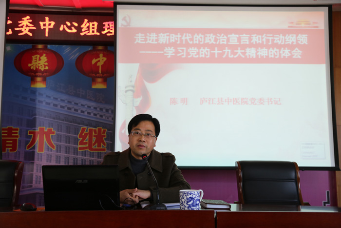 1月12日下午,庐江县中医院组织召开党委中心组理论学习(扩大)会议,深入学习贯彻党的十九大精神,医院党委书记陈明从十九大的主题及主要成果、中国特色社会主义进入新时代、我国现阶段社会主要矛盾发生转化、坚定不移推进全面从严治党等六个方面,向大家原汁原味、详细具体、深入透彻地宣讲了党的十九大精神,院党委中心组成员;院工会主席、团委书记、妇联主任;院中层干部;全体党员以及积分子等200余人聆听了这堂振奋人心的党课。