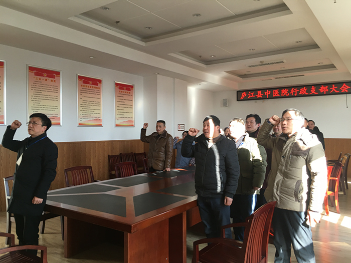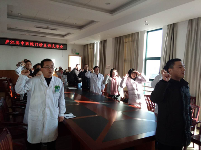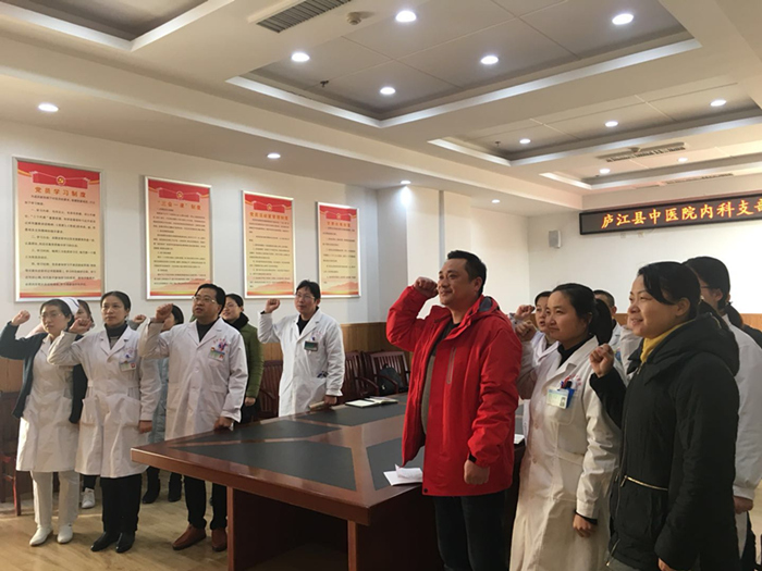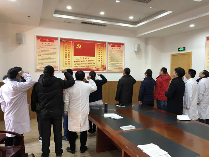 “我志愿加入中国共产党,拥护党的纲,遵守党的章程,履行党员义务,执行党的决定......”县中医院四大党支部——行政支部、门诊支部、内科支部、外科支部的党员正面向党旗,举起右拳,齐声宣读入党誓词。宣誓声铿锵有力,回荡在党员活动室中。