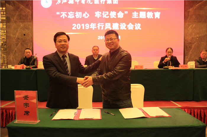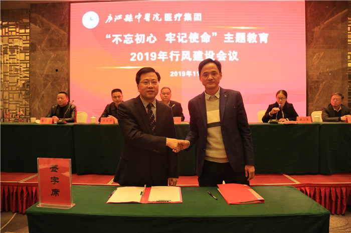 县中医院医疗集团负责人金牛分院左从霞院长、大内科王寅主任签订行风建设承诺书。会后其他分院及科室将分别签署承诺书备案。