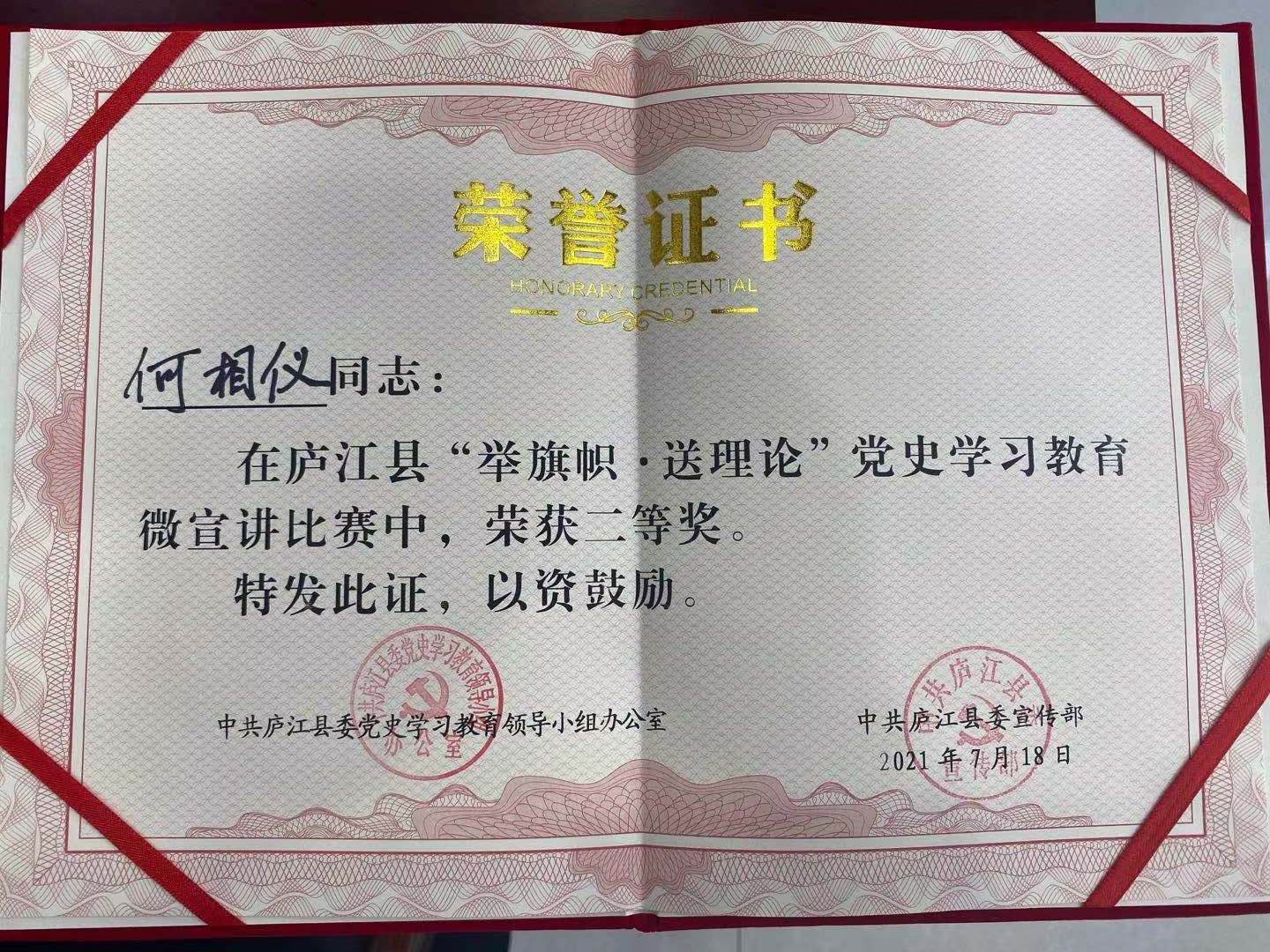 7月18日 由县委党史学习教育领导小组办公室、县委宣传部主办的“举旗帜·送理论”党史学习教育微宣讲比赛在县文旅局举办。来自县直单位、各镇(园区)的30名选手用自己的激情宣讲来表达对党最真挚的祝福,我院何相仪在比赛中荣获二等奖。