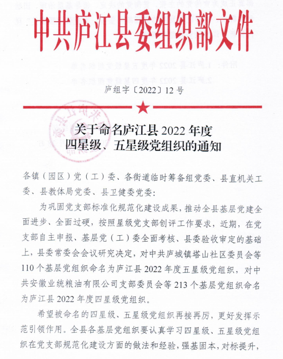 近日,县委组织部下发了《关于命名庐江县2022年度四星级、五星级党组织的通知》,庐江县中医院康复医学支部、庐江县中医院医疗集团万山分院支部获批2022年度五星级党组织。庐江县中医院内科一支部、庐江县中医院药学支部、庐江县中医院医疗集团白山分院支部获批2022年度四星级党组织。