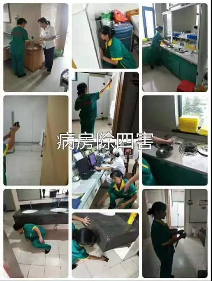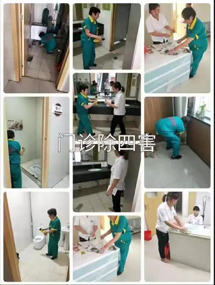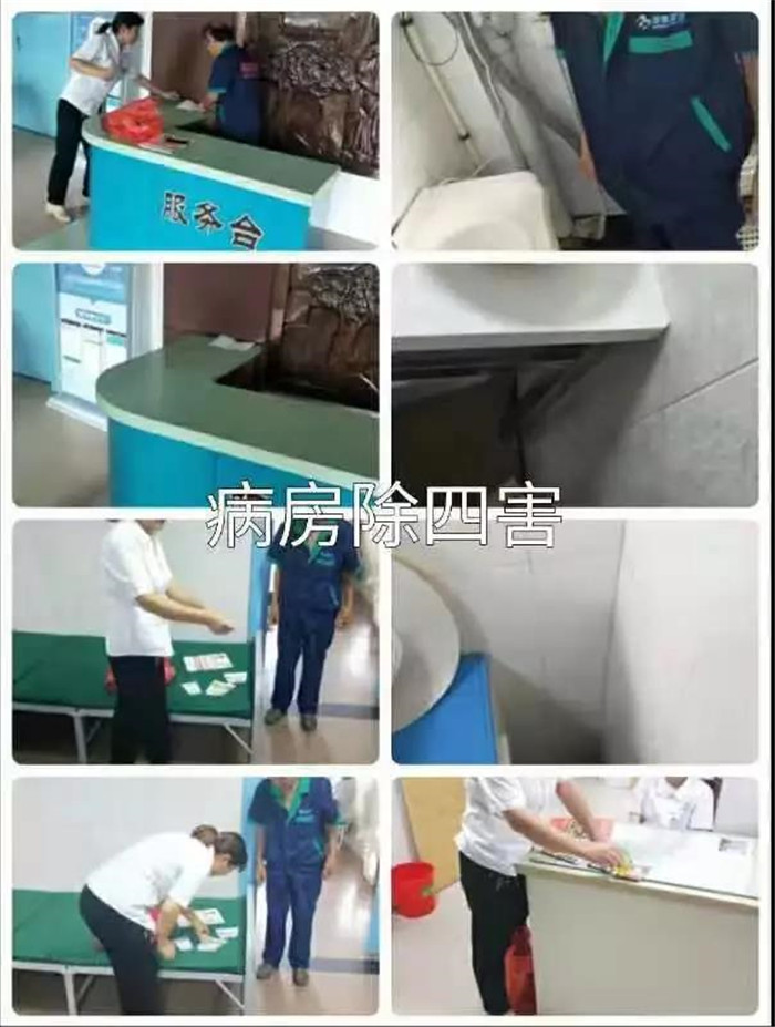 在医院内门诊和住院病区的拐角、公厕及院内蚊、蝇易孳生活动处喷洒灭蚊水、放置粘蝇板,同时在老鼠、蟑螂经常出没的地方使用灭鼠夹和灭杀蟑螂药物,并制作海报放置于门诊大厅以加强宣传。