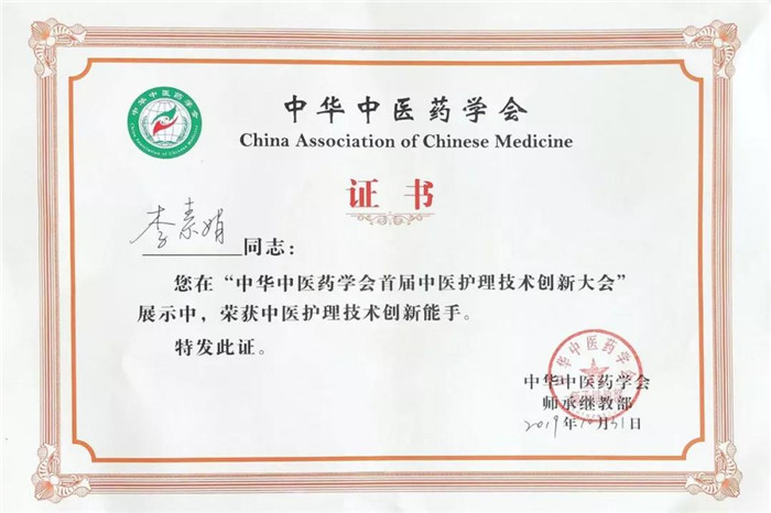 近日,由中华中医药学会主办的“中华中医药学会第十七次中医护理学术交流会议暨中医护理技术创新大会”在福州召开。由我院李素娟、潘玉荣、钱媛媛组成的参赛团队,以“艾柱制作器的设计与应用”项目荣获“中医护理技术创新能手奖”。