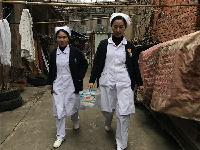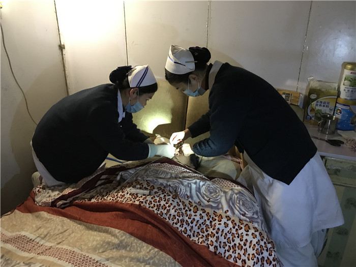 由于患者肢体偏瘫加上天气寒冷(生命体征平稳),家属反映其出行不便,在院护理部的组织安排下,外科护士长张翠华带医护人员亲自上门,为患者更换胃管、尿管,并给予相关知识的宣教。