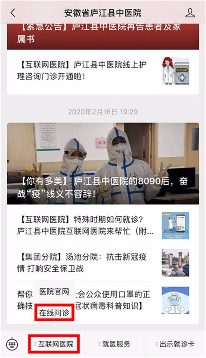 率先开通“互联网医院”,并提供实时在线问诊免费咨询服务。关注“安徽省庐江县中医院”微信公众号,点击【互联网医院】菜单下的【在线问诊】,通过选择科室进行在线咨询就诊。