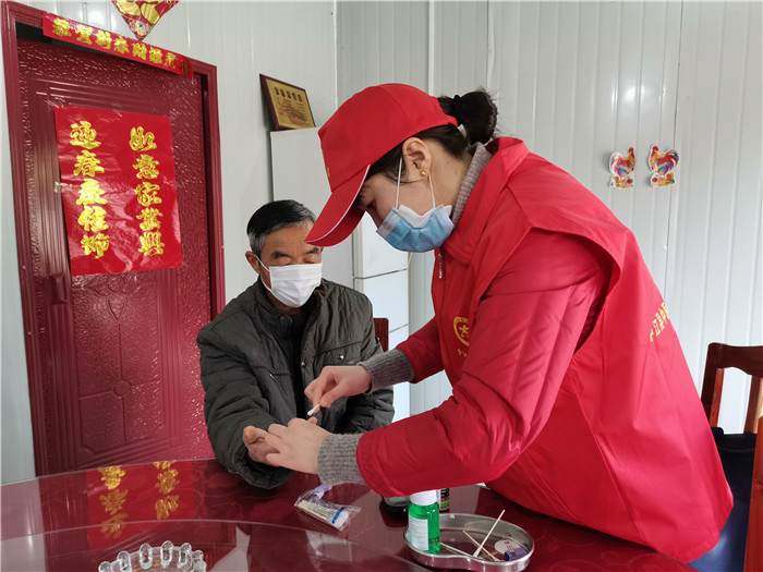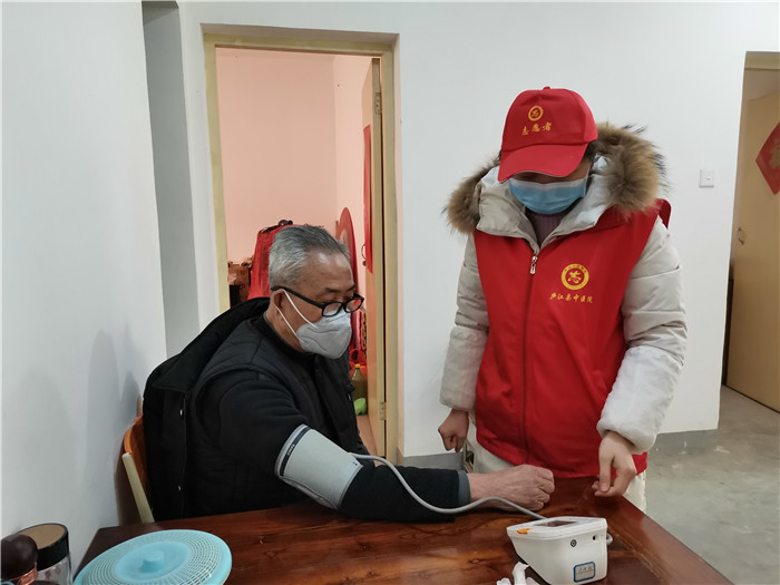 志愿者们先后来到支援武汉医务人员胡斌、卢睿敏、孔玉龙的家中,看望慰问了他们的父母和其他亲属,送去了慰问品,并致以诚挚的敬意和衷心的感谢。同时,提供量血压、测血糖等志愿服务,了解家中老人的身体情况,进行健康指导,叮嘱老人每天开窗户通风,出门戴好口罩,平时多保重身体。