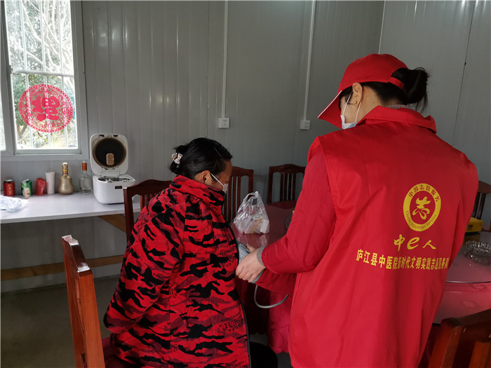志愿者为卢睿敏父亲量血压,送去所需药品