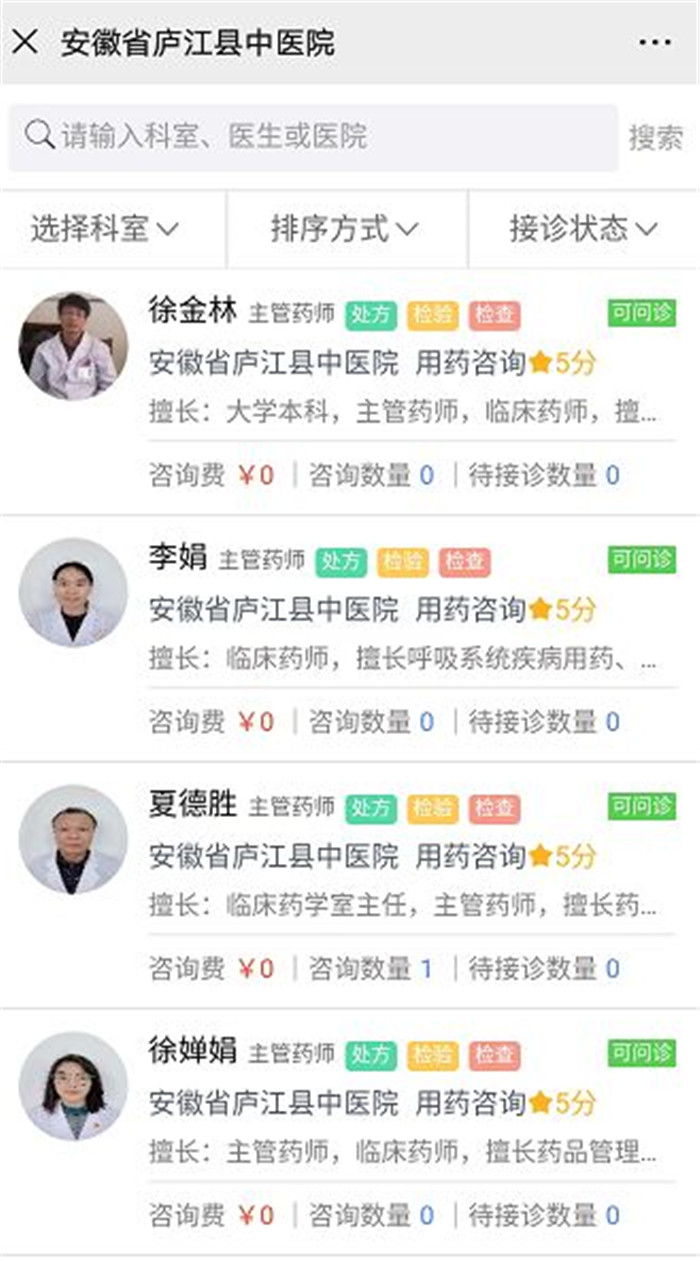 3月7日,为了更便捷地为患者提供科学合理的用药服务,庐江县中医院开通用药咨询线上门诊。药师在线免费提供药品具体信息以及治疗药物使用、保存等咨询,让患者足不出户可以知晓医院药品目录、库存情况,享受对的个性化用药指导服务。