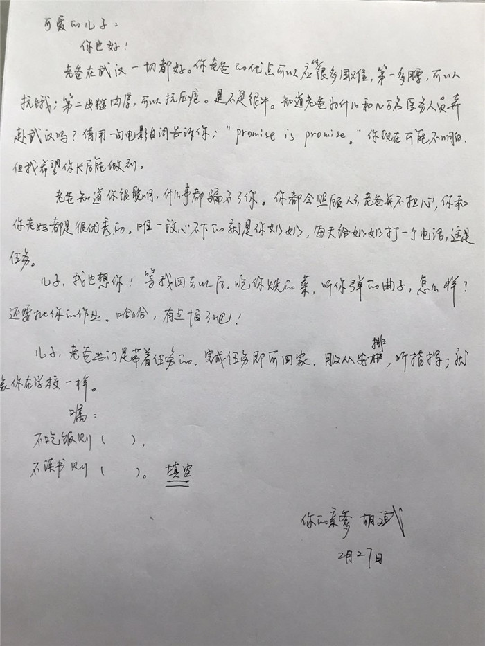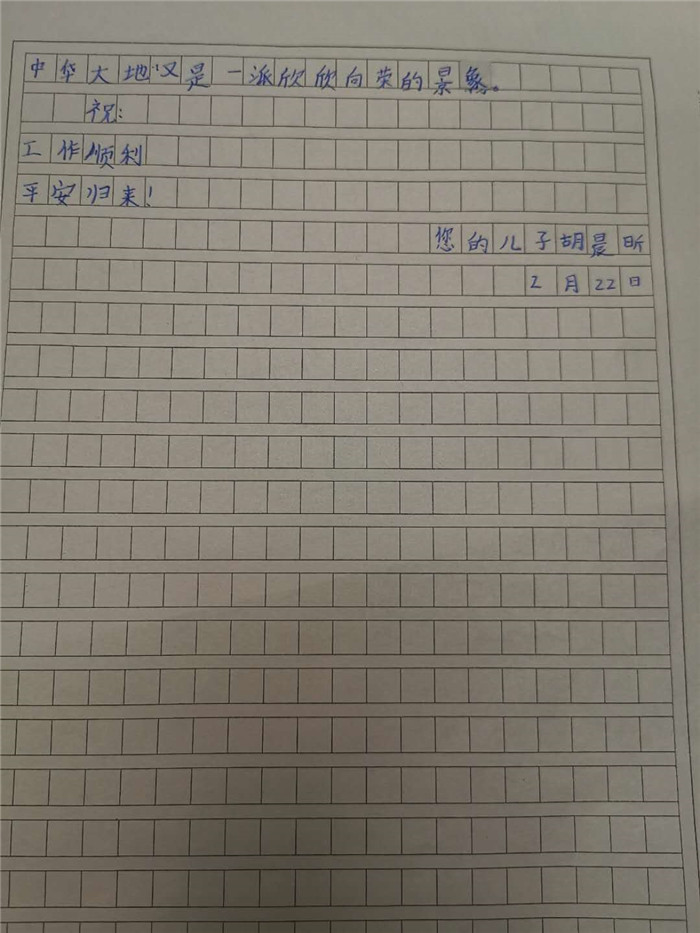 近日,身在前线战“疫”的胡斌收到了来自10岁儿子胡晨昕的封信,这封信寄托了儿子对爸爸的强烈思念和牵挂。这份“稚嫩的牵挂” ,让大家湿润了眼眶。