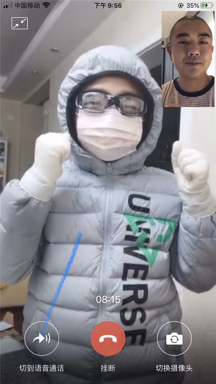 天的“战斗”结束后,胡斌才抽出空和儿子视频。视频中,儿子戴好口罩、护目镜、手套,学着爸爸在前线抗“疫”的模样,为爸爸加油!