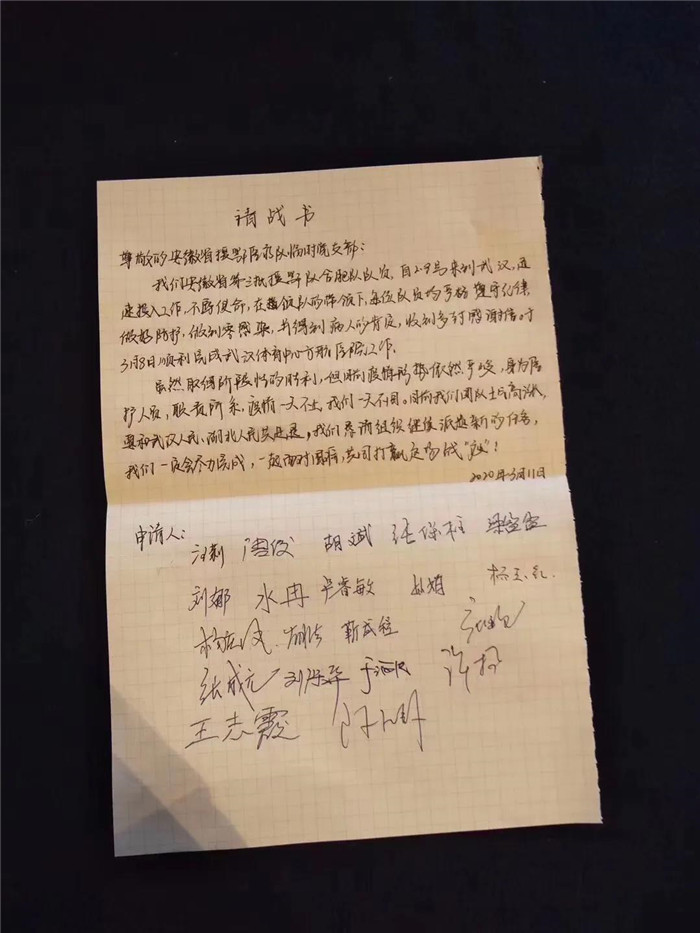 在原地休整之余,胡斌、卢睿敏和他的“战友”们主动写下请战书,疫情天不止,他们天不回!