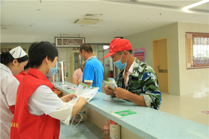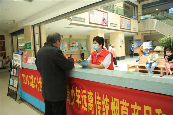 在医院内,志愿者及控烟督导员们向前来就诊的患者及家属发放控烟、戒烟宣传册,讲解吸烟有害保健常识,向家长宣讲青少年吸烟的危害,号召青少年增强控烟意识,远离烟草,倡导健康的生活方式。