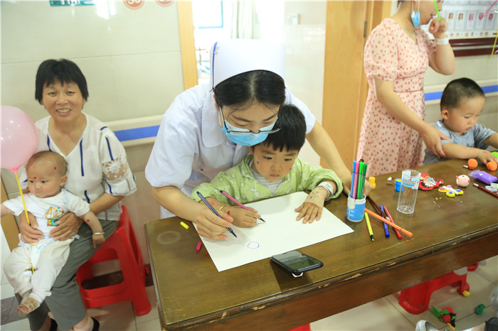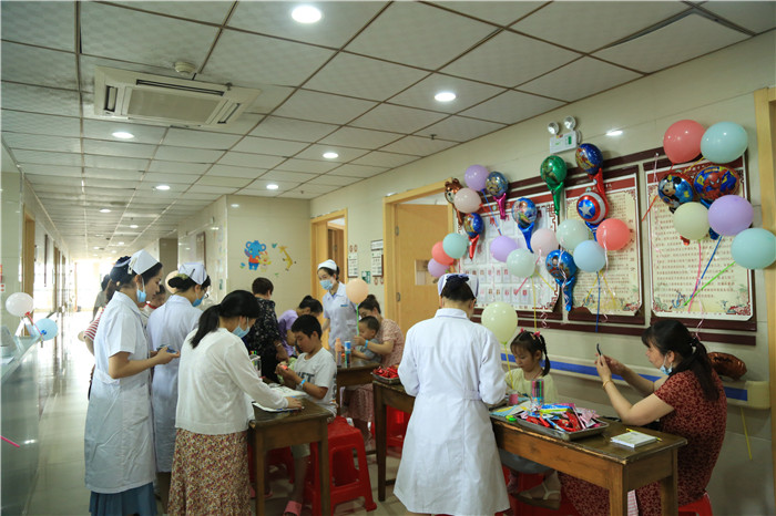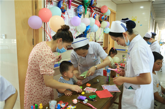 6月1日上午,在我院儿科病区,片欢声笑语。儿科医护人员精心准备,病房和门诊早已气球高挂,节日的气氛将孩子们的笑脸映衬的格外喜庆。