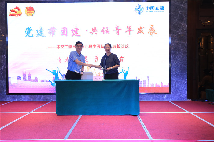 座谈结束后,庐江县中医院党委副书记钱小清与中交二航局长江国际公司党委副书记、工会主席覃磊签订《党建共建协议》。