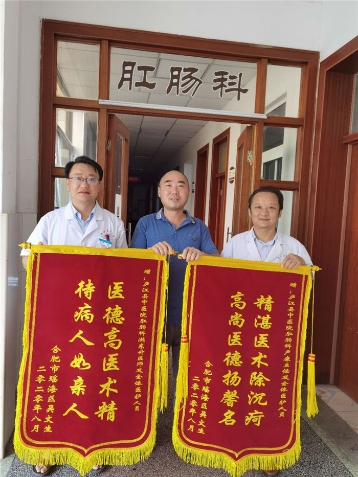 近日,家住合肥市瑶海区的吴先生将两面写有“医德高医术精 待病人如亲人”“精湛医术除沉疴 高尚医德扬馨名”的锦旗送到了庐江县中医院肛肠科主任卢康及主治医师洪东升的手中,感谢肛肠科所有医护人员对他在住院期间的精心治疗和细心护理。