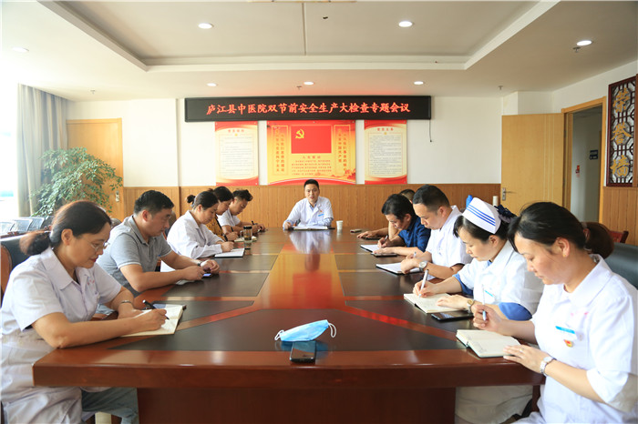 在国庆、中秋佳节来临之际,为切实做好双节期间医院各项安全生产工作,坚决预防和遏制各类安全生产事故的发生,9月28日下午,庐江县县中医院召开安全生产大检查专题会议。分管院长王大力,后勤保障部、药学部、医学装备科、护理部、感控办、质控办、信息管理科、保卫科等科室负责人参加。