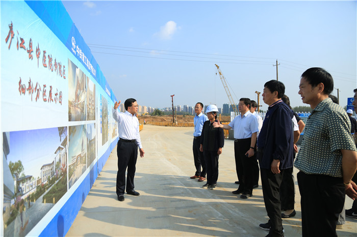 县关工委主任尚新梅、人大一级调研员朱仲平一行调研庐江县中医院新院区建设情况