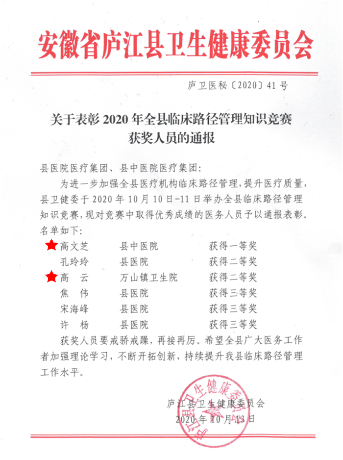 庐江县中医院医疗集团喜获全县临床路径管理知识竞赛一、二等奖!