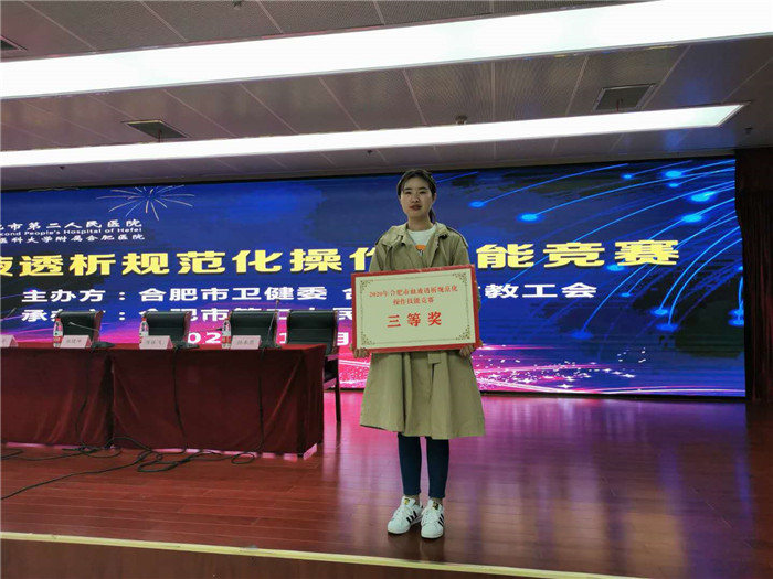 10月18日,合肥市血液透析规范化操作技能竞赛如期举行。经过激烈角逐,庐江县中医院血液净化中心胡荧荧在29位选手中脱颖而出,荣获三等奖!