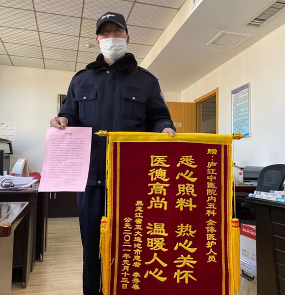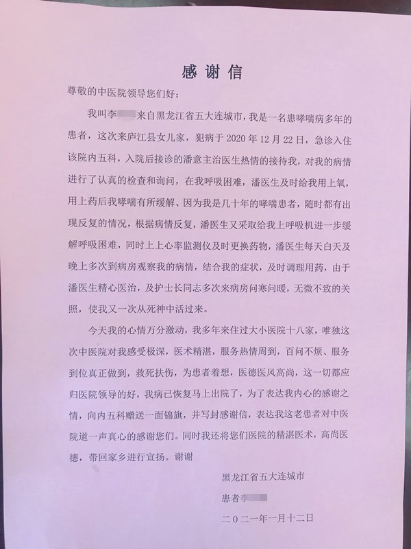 1月13日,庐江县中医院内五科收到了患者家属送来一面写有:“悉心照料 热心关怀 医德高尚 温暖人心”的锦旗和一封感谢信,感谢内五科全体医护人员精心治疗和无微不至的护理服务。
