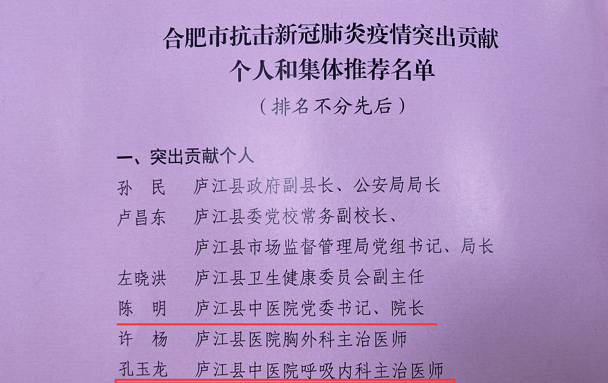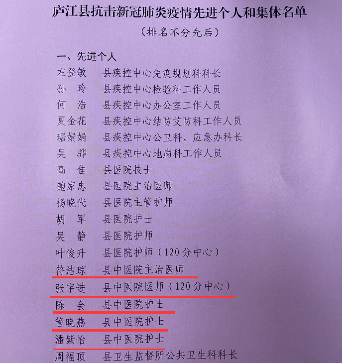 1月13日下午,在全县抗击新冠肺炎疫情、抗洪救灾表彰大会上,庐江县中医院荣获“全县抗击新冠肺炎疫情先进集体",党委书记、院长陈明,安徽省第七批支援武汉医务人员、我院发热门诊主任孔玉龙获得”合肥市抗击新冠肺炎疫情突出贡献个人"荣誉称号,我院医护人员符洁琼、张宇进、陈会、管晓燕、潘紫怡以及医疗集团白山分院院长杨旭东,汤池分院院长黄振华和金牛分院院长左从霞等多名同志荣获“庐江县抗击新冠肺炎疫情先进个人”荣誉称号。