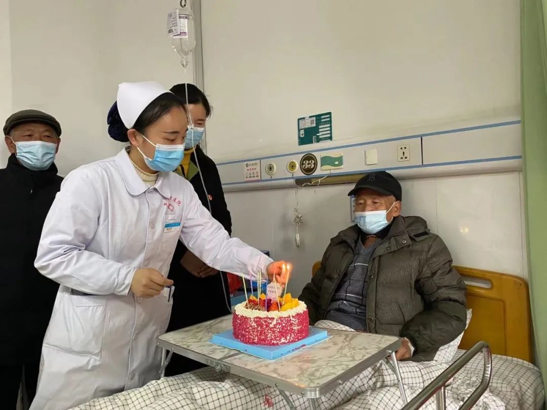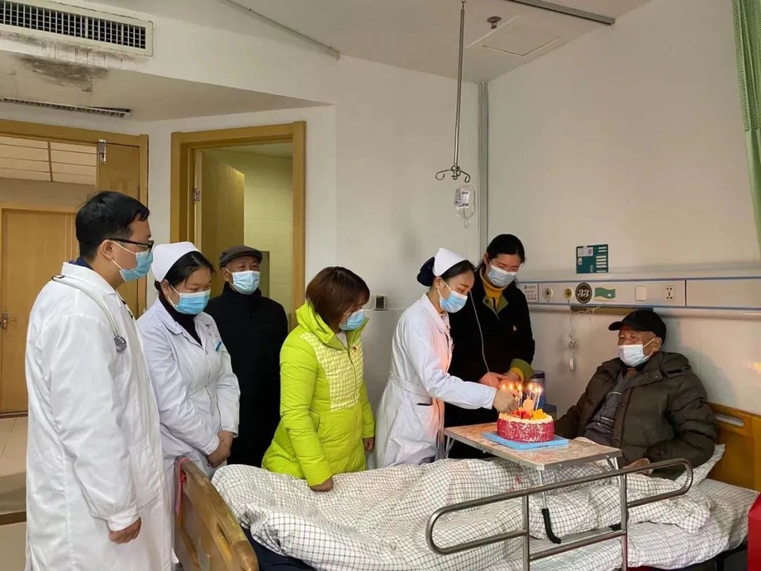 住院期间,医护人员经常到床前看望老人,得知今天(腊月二十七)是陈爷爷的生日,医护人员和陈爷爷所在镇的镇政府领导共同为老人举办一场特殊的生日,唱起生日歌,共同祝福老人身体健康,幸福长寿。