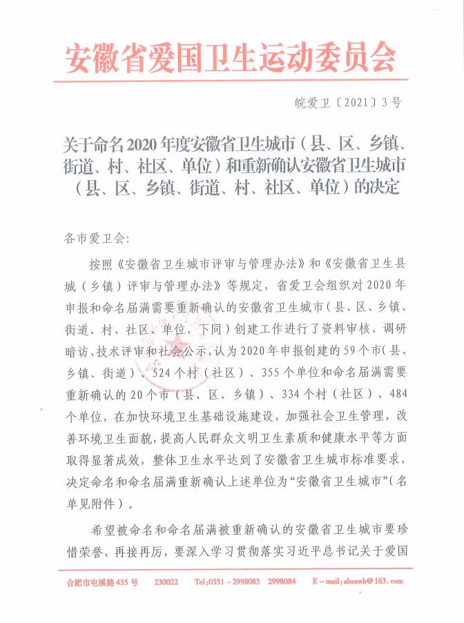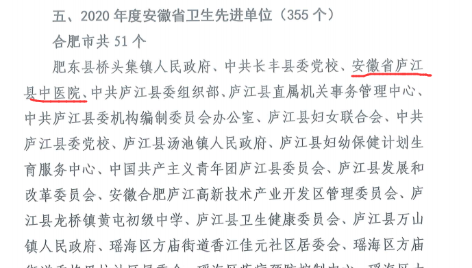 近日,安徽省爱国卫生运动委员会印发了《关于命名2020年度安徽省卫生城市(县、区、乡镇、街道、村、社区、单位)和重新确认安徽省卫生城市(县、区、乡镇、街道、村、社区、单位)的决定》,授予庐江县中医院2020年度“安徽省卫生先进单位”荣誉称号。