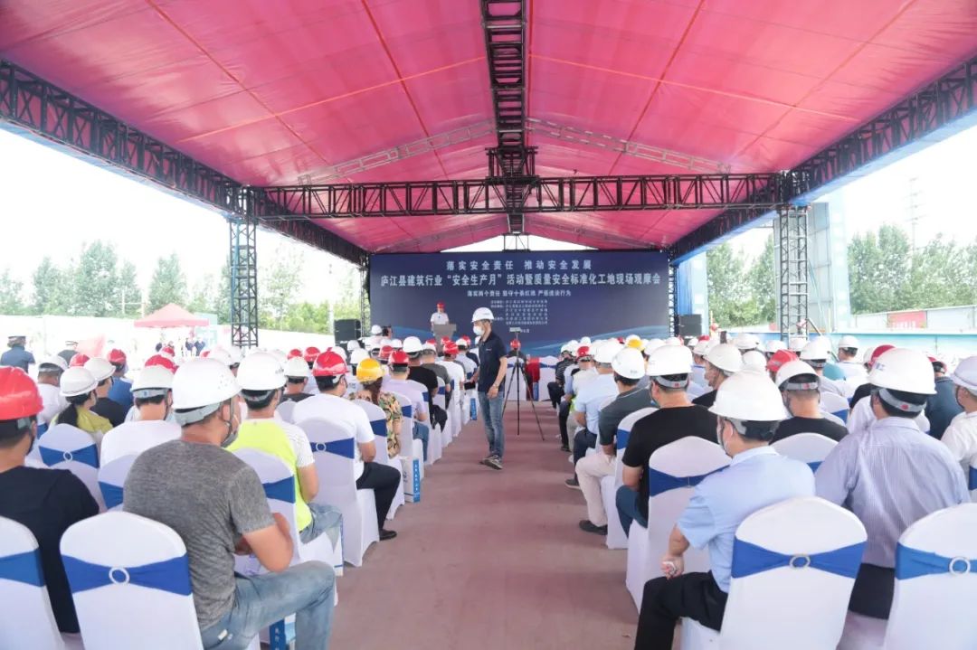 6月15日上午,2021年庐江县建筑行业“安全生产月”活动暨质量安全标准化工地现场观摩会议在我院城西院区项目部举行。县住建局、县重点工程建设管理中心负责人,县建筑业协会会长及县住建局质安科和质安站全体成员,庐江县中医院院长董召斌及班子成员参加活动。此次活动对全县建筑施工“安全生产月”活动进行了总体部署,通过观看安全生产警示宣传片、宣读建筑行业安全责任承诺书,积极倡导安全生产文化,进一步落实安全责任,推动安全发展。随后与会领导和企业负责人对庐江县中医院城西院区项目的安全生产和文明施工进行了现场观摩。