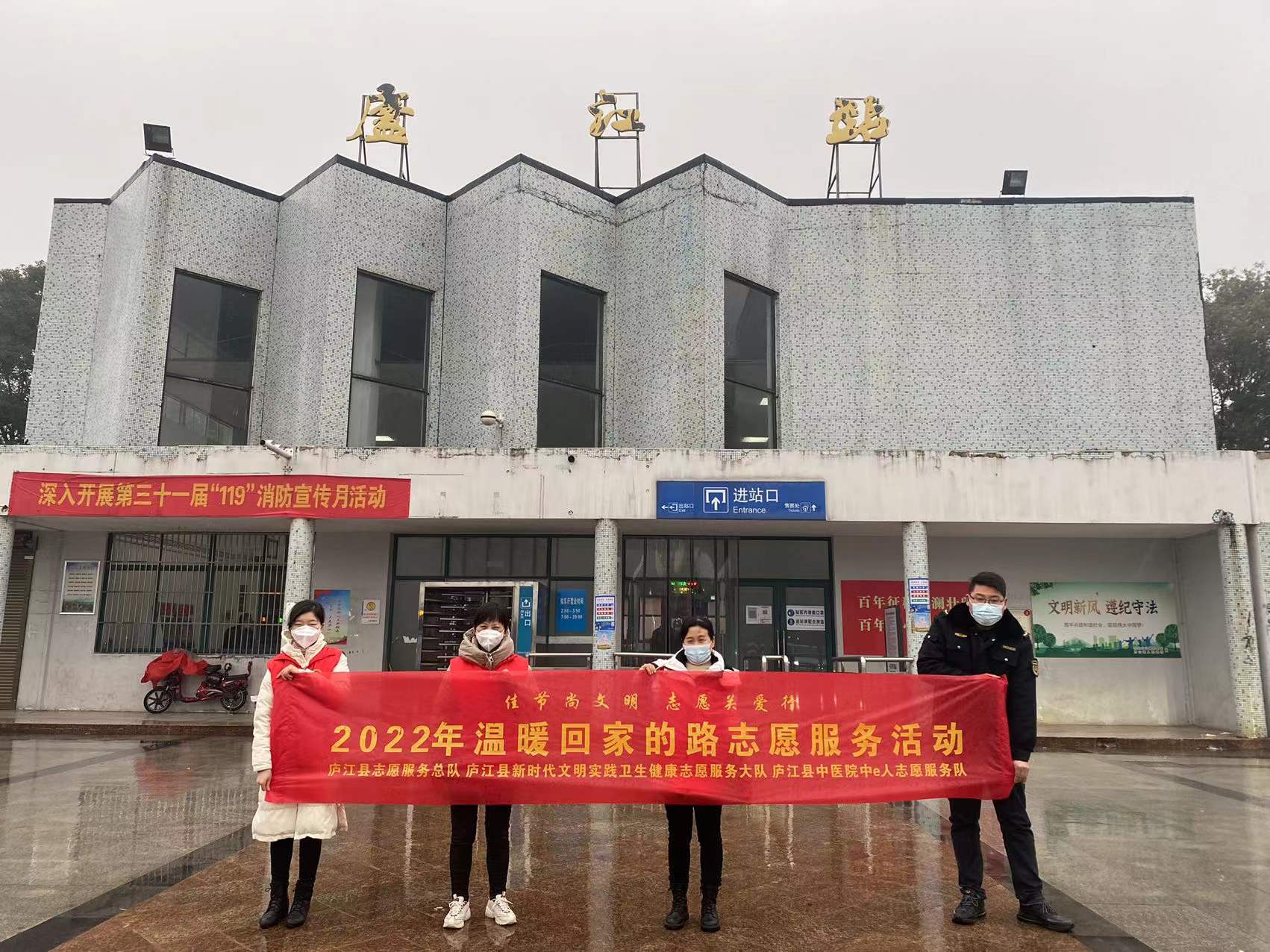 1月26日,庐江县中医院中e人志愿服务队走进庐江火车站,开展2022年温暖回家的路志愿服务活动,为寒冷冬日返乡的旅客送去温暖和爱心。