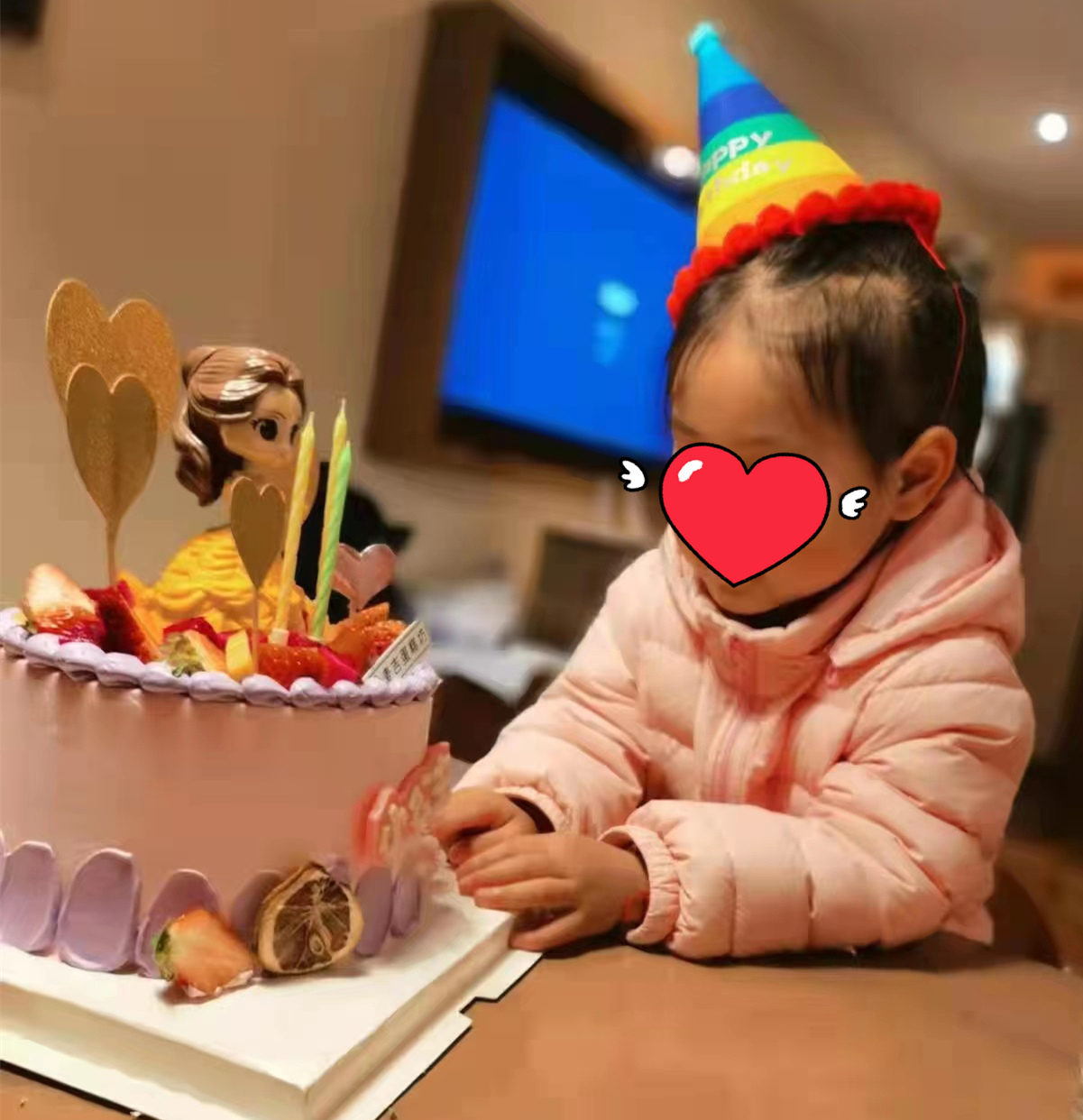 看到生日蛋糕的小朋友倍感惊喜,戴上生日帽,开心地说道:“哇,大蛋糕!”