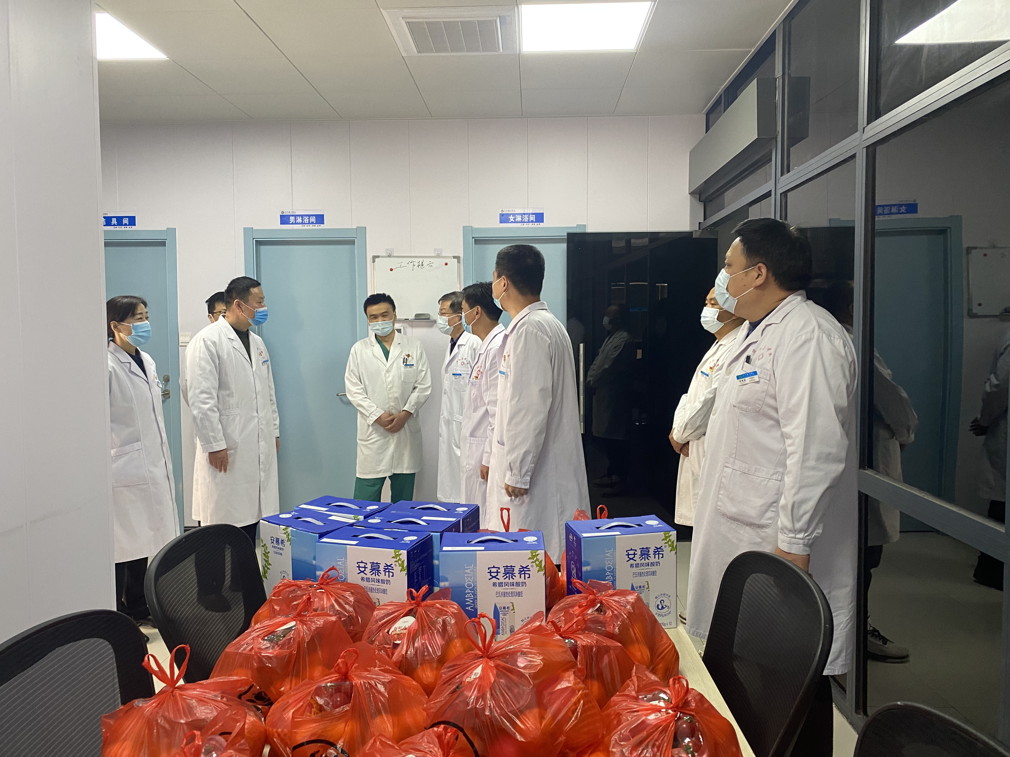 4月6日上午,院领导班子成员、院工会一行看望慰问发热门诊医护人员,对他们奋战在疫情防控一线表示感谢,并送上牛奶、水果等慰问品。