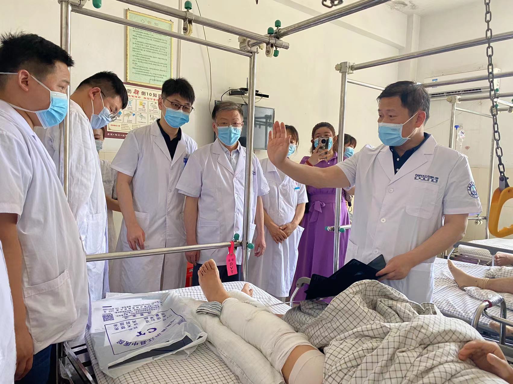 中国科学技术大学附属第一医院副院长方诗元带队走进我院骨伤二科,对相关疑难病例进行了查房,并对我院医护人员进行现场教学和技术指导。