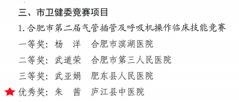 此次朱茜代表我院参加竞赛并获奖,充分展示了重症医学科医务工作者良好的综合职业素质。庐江县中医院将以此次竞赛为契机,踔厉奋发,持续提升服务能力和水平,更好地造福于广大百姓。