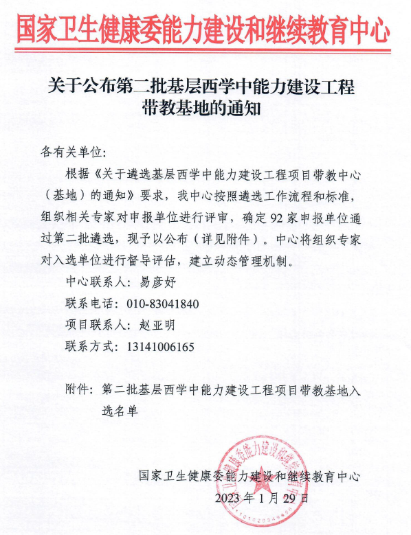 近日,国家卫生健康委能力建设和继续教育中心下发《关于公布第二批基层西学中能力建设工程带教基地的通知》,庐江县中医院成功入选。