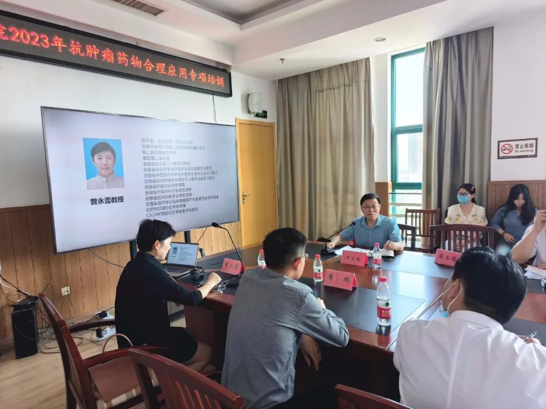 为加强抗肿瘤药物临床应用管理,提高抗肿瘤药物临床应用水平,6月6日,庐江县中医院临床药学室邀请安徽中医药大学第二附属医院肿瘤科主任曾永蕾和中国科学技术大学附属第一医院抗肿瘤临床药师季鹏来我院开展2023年度抗肿瘤药物合理应用专项培训。