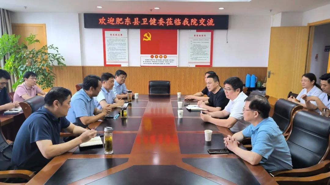 6月19日上午,肥东县卫健委主任科员、党委委员郑策,肥东县卫健委党委委员、县中医院党委书记赵俊淮,肥东县中医院院长张成元等一行6人来我院就智慧中药房建设、医共体建设等方面工作进行交流。党委书记董召斌、院长王大力、副院长洪文格、副院长杨旭东及医务科、药剂科、中药房等科室负责人参加座谈会。