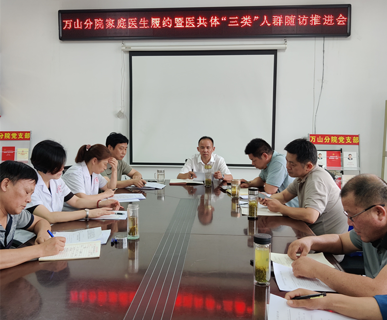 为持续推进医共体建设高质量发展,9月4日,万山分院召开家庭医生履约服务、基本公共卫生服务暨医共体“三类人群”随访工作推进会,院班子成员、全体村卫生室站长和镇包保医生参加会议。