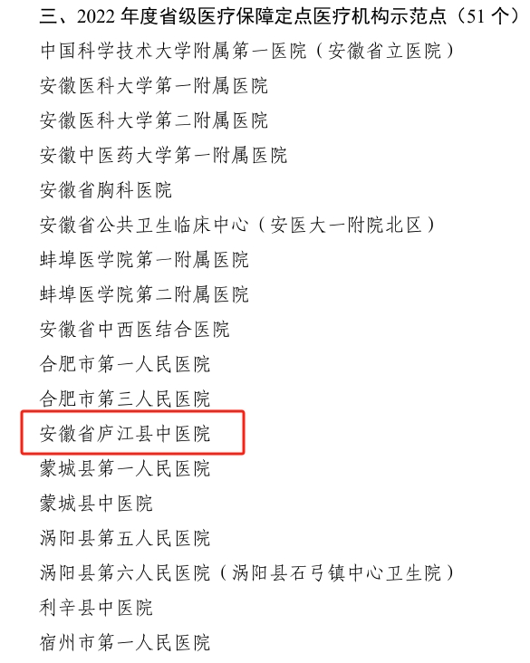 近日,安徽省医疗保障局公布了《2022年度省级医疗保障服务示范点名单》,庐江县中医院榜上有名,荣获2022年度“省级医疗保障定点医疗机构示范点”称号。