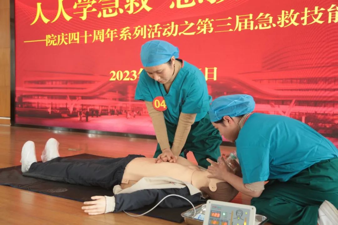 操作考试通过模拟真实情景,考核医护人员在遇到突发急救事件时的救治能力以及团队配合默契度。比赛项目包含双人心肺复苏、电除颤仪技能操作比赛。