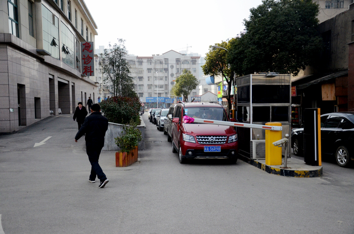 在医院大院里面,能停车的地方都已经都停得满满当当了,车辆只有排队等待车位才能进来。管理人员在里面调整安排车位,疏通车辆进出。