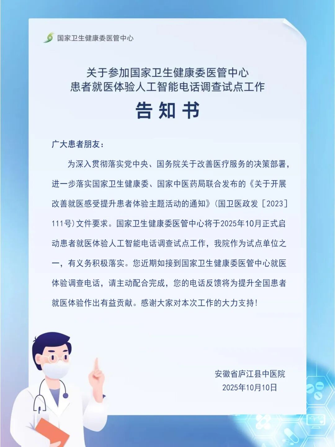关于参加国家卫生健康委医管中心患者就医体验人工智能电话调查试点工作告知书