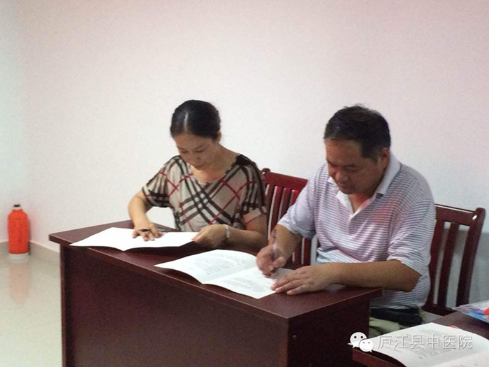 县卫计委党委副书记徐业松(右)与我院分管院长钱小清(左)签订《征兵体检工作责任书》