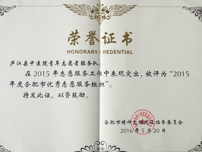 庐江县中医院青年志愿者服务队在2015年志愿服务工作中表现突出,被评为“2015年度合肥市秀志愿服务组织”。 庐江县中医院青年志愿者服务队成立于2013年,现有志愿者人数175人。近年来,志愿者们直坚持以“服务为本、亮点带动、塑造形象”为工作重点,大力弘扬“奉献、友爱、互助、进步”志愿精神,充分发挥我院中医特色治疗,多次走进社区、养老院,开展形式多样的义诊活动,将中医保健、八段锦、太拳、拔火罐、艾灸、冬病夏治的穴位贴敷等传统的中医养生知识传授给大家。