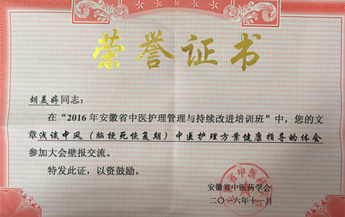2016年11月22日—25日在省城合肥举行的“安徽省中医护理管理与持续改进培训班”年会上,我院康复科胡美婷撰写的论文《浅谈中风(脑梗死恢复期)中医护理方案健康指导的体会》入选大会壁报交流,得到与会专家的高度赞扬。 此次壁报交流从千多篇论文中选出8篇论文入选,我院胡美婷撰写的论文入选,进步证明我院在临床科研方面已经具有定的学术地位和影响力。