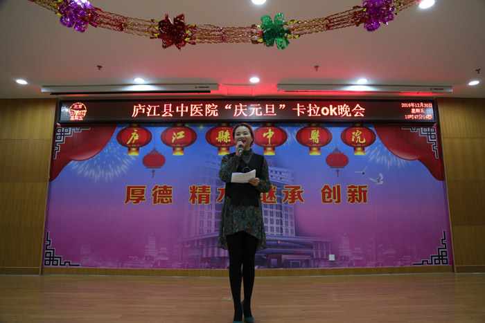 舞动青春、欢度新年,庐江县中医院“庆元旦”卡拉OK晚会于12月30日晚隆重举行。伴随着支支激情、欢快的歌曲,天使们依次登场,尽展歌喉。张张神采飞扬的脸庞,显示了医务工作者的奕奕风采。歌声、笑声、掌声、欢呼声此起彼伏。话不多说,让我们来睹天使们的风采吧! 整场晚会在片欢快的气氛中结束,展示了医护人员良好的精神风貌,也吹响了庐江县中医院2017年新征程的号角!