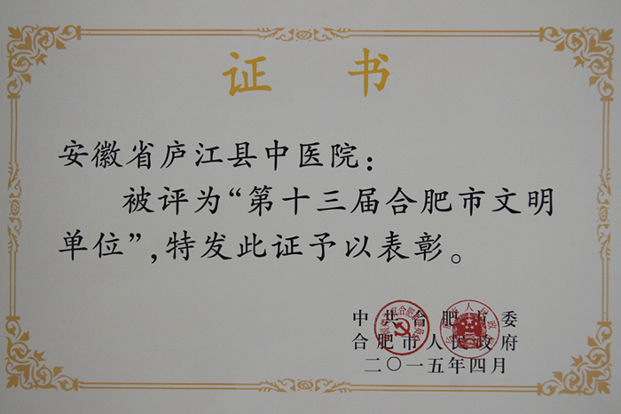 近日,合肥市市委、合肥市市政府命名表彰了合肥市第十三届文明单位,我院再次荣获这称号。这也是我院连续两届荣获这殊荣。 近年来,我院以建设文明、高效、廉洁医院为目标,进步加强作风建设,促进精神文明与医院文化的有机融合,充分调动员工参与精神文明建设的积性、主动性、创造性,推动我院精神文明建设工作的常态化开展。 医院将在今后的创建工作中珍惜荣誉,再接再厉。继续推动医院科学发展、和谐发展,不断开创医院精神文明建设工作的新局面,为打造文明、和谐的新合肥作出更大贡献。