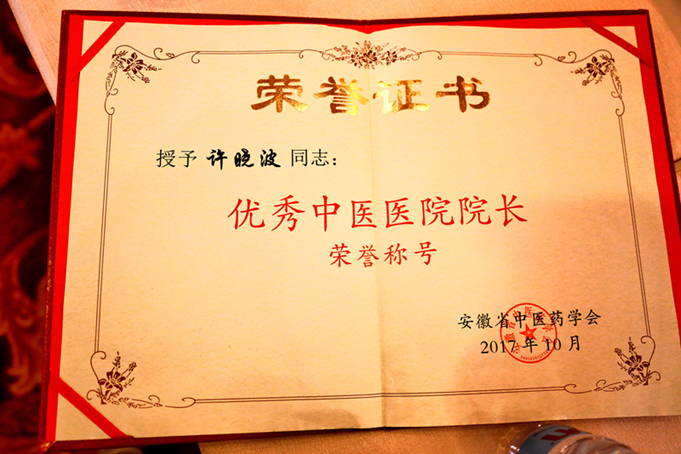 安徽省中医药学会2017年学术年会暨届黄山论坛于10月14日在合肥市国际会议展览中心举行。会上颁发了安徽省中医药学会科技进步奖、安徽省秀中医医院院长等奖项。 本次获奖的10名秀院长经各市中医药学会推荐,专家评审并公示,均为我省中医院院长中脱颖而出的秀代表,许晓波院长此次获评安徽省“秀中医医院院长”,既是对许晓波院长长期以来为医院建设发展及助推医疗卫生事业做出的贡献而给予的肯定,也是业界对我院近年来的快速发展的肯定。
