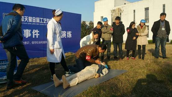 应急演练活动分为讲座和演练两个部分:江映天副主任就安徽天星金属工艺有限公司常见到的强酸强碱的防护和急救知识作了培训;汪姝卉护士长从急救基本知识和急救基本技能着手,将新的心肺复苏术和临床急救相结合,通俗易懂的讲解了急救常识,并利用模型和120急救中心的医护人员起进行了"徒手心肺复苏术"现场演示。